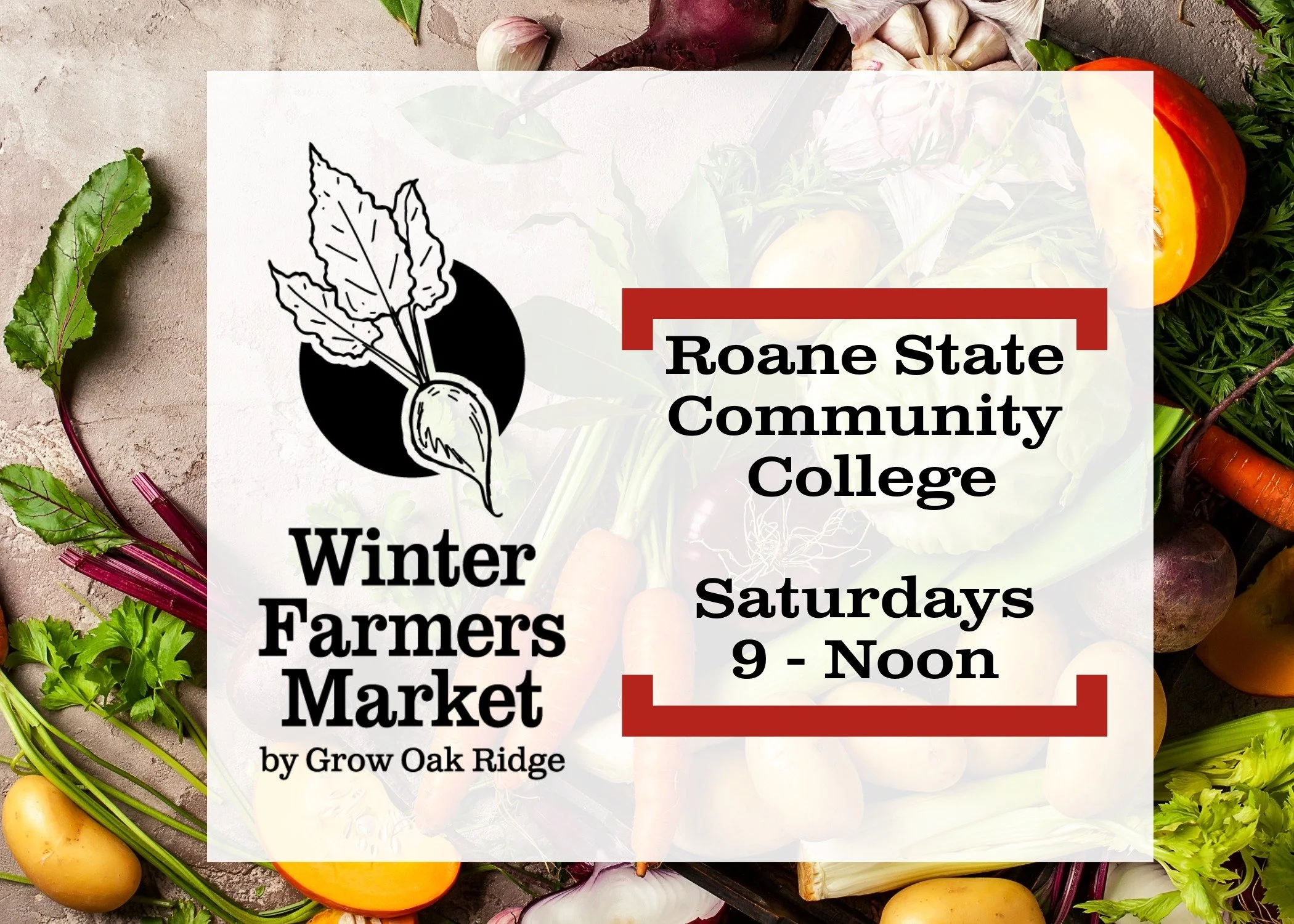 Winter Farmers Market - Open INDOORS all winter, Saturdays 9 a.m. to Noon, Oak Ridge campus of Roane State Community College. 701 Briarcliff Avenue, Oak Ridge, TN